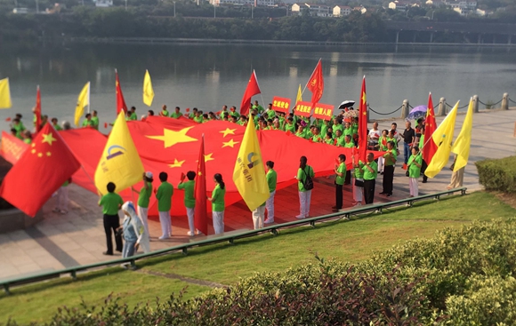 金色的晨曦中,鮮艷的五星紅旗迎風招展,紅旗的映襯下,身為中華兒女的麗汽人笑容綻放、步伐矯健,《我和我的祖國》那熟悉的旋律在防洪堤的上空久久回蕩……