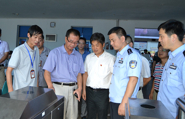7月13日下午,市委常委、區委書記葛學斌、蓮都區公安局局長葉建利等領導在集團公司董事長葉茂的陪同下到客運東站調研護航G20安保工作情況。一行人經過人物分離的安檢通道進入長途班車候車廳,在聽取東站經理江小華介紹下親自體驗了客運東站新安裝的實名檢票系統。葛書記對客運東站的安保工作表示滿意,強調護航G20工作已經進入臨戰階段,作為車站要切實加強出入安全檢查,扎實做好各項安保工作,堅決打贏“護航G20,平安奪金鼎”這場硬戰爭。
