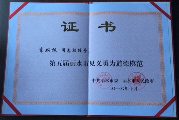 12月9日,蓮都區委區政府在蓮都劇場召開表彰會,表彰蓮都區第五屆道德模范獲獎者。麗汽集團長運公司駕駛員章雙林同志獲見義勇為道德模范受到表彰。 在10月31日,章雙林還獲得麗水市第五屆見義勇為道德模范,受到市委市政府表彰。