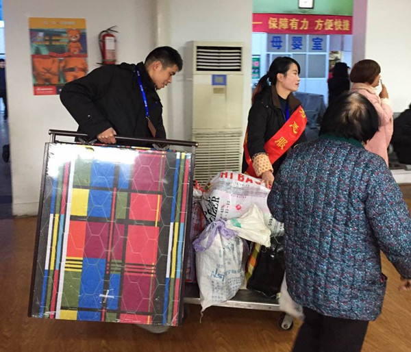 這時,業務站站長陳樂觀恰巧巡查到南大門,見狀立刻上前一把接過折疊椅說道:“趕緊放手,本來腰就不大好,回家還要帶小孩,萬一再出點閃失扭了腰,連小孩都抱不動就麻煩了。”一聽是一個新媽媽,傍邊的大媽更是心疼了,“小姑娘,我不知道你還是新媽媽,來來來,趕緊把床給我”,說著就伸手去接床。“沒事,沒事,再堅持一下就到了,你趕緊進去,快開車了。”
