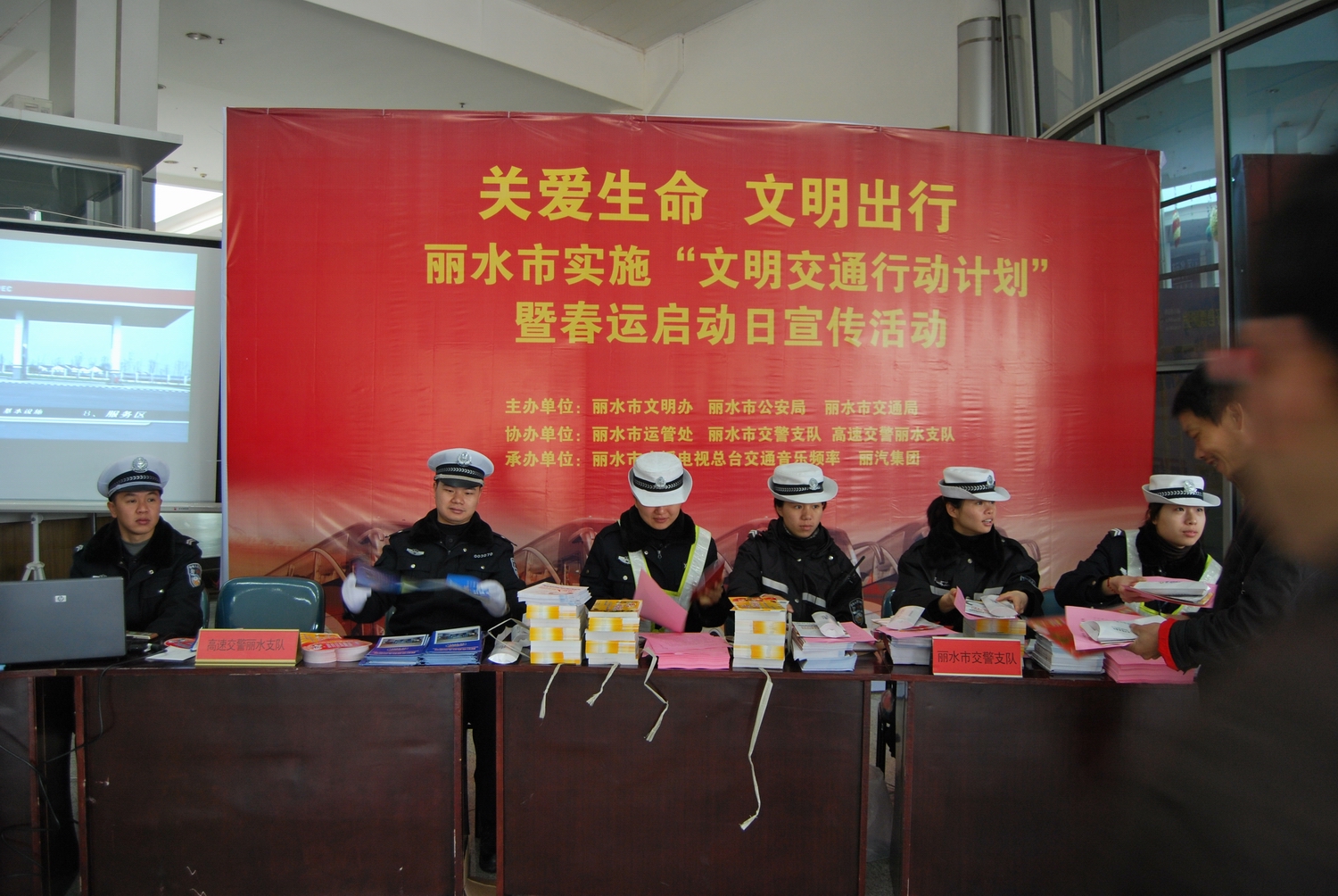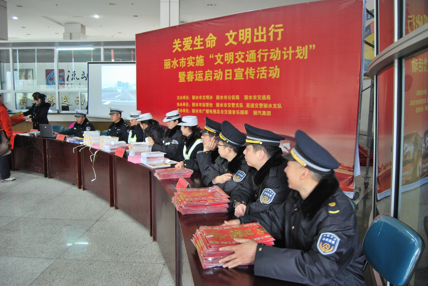 春運(yùn)首日,由麗水市文明辦、麗水市公安局、麗水市交通局主辦,麗水市運(yùn)管處、麗水市交警支隊(duì)、高速交警麗水支隊(duì)協(xié)辦,麗水電臺(tái)交通音樂頻率、麗汽集團(tuán)承辦的 關(guān)愛生命 文明出行 麗水市實(shí)施“文明交通行動(dòng)計(jì)劃”暨春運(yùn)啟動(dòng)日宣傳活動(dòng)在麗水客運(yùn)西站舉行。