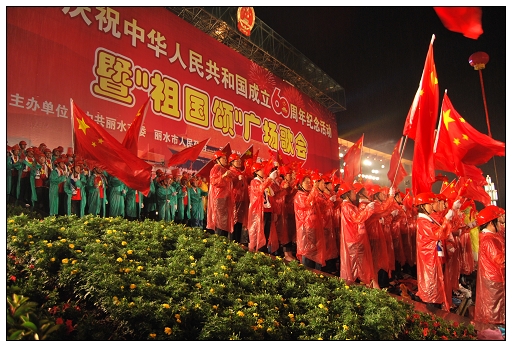 麗水市慶祝新中國成立60周年紀念活動暨“祖國頌”廣場歌會隆重舉行。歌會分革命英雄贊、建設新中國、走進新時代三個篇章進行。15個方陣依次進行大合唱,每個方陣各唱一首歌。