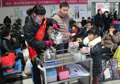 2月8日冷空氣來襲,雨夾雪,一大早西站“流動之家”服務班的姐們就準備好一大壺熱氣騰騰的姜茶,并將一杯杯熱氣騰騰的姜茶送給返鄉旅客,在幫助他們抵御嚴寒的同時使他們從內心感受到“家”的溫暖與關愛。