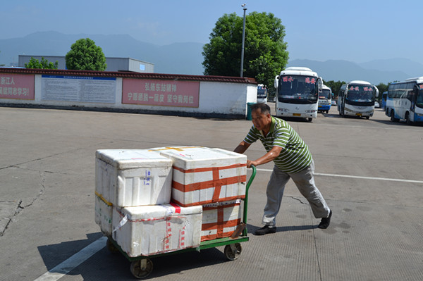 說話間,一輛班車緩緩駛入車站。在下客區等候的江永貴和同班的胡瑞華快速地打開車輛行李倉。“一件、兩件、三件、四件……”江永貴一邊念著數字一邊熟練地搬著貨物,一件件貨物在他們手上快速頻繁地拿起、放下。雖然揮汗如雨,但規范操作程序卻絲毫不受影響:仔細核對貨號、件數、 到達站點、駕駛員簽名…… ,對精密電子設備、易碎物品、海鮮等 ,他們總是不忘給予特殊的“關照”。這看似簡單機械,沒有技術含量的工作,卻需要莫大的毅力和耐心。車艙狹小,為適應卸貨碼貨的需要,他們不停的變換姿勢,時而曲膝半蹲,時而探身彎腰,片刻,他們剛剛有點晾干的工作服又一次被汗水浸透了。