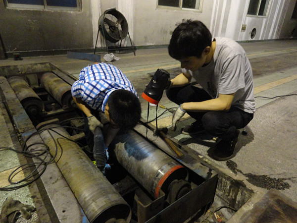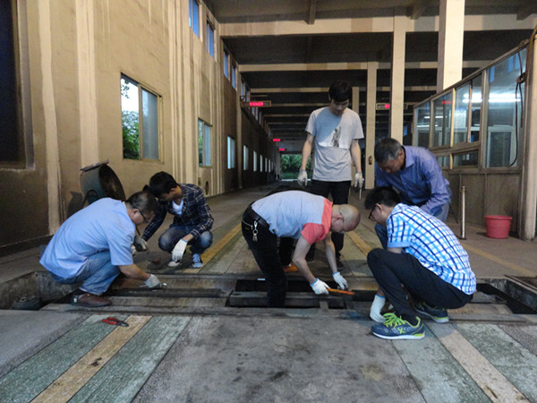 7月7日下午臨下班前,綜檢站1號(hào)檢測(cè)線的車速臺(tái)突然發(fā)生故障,舉升器無法正常升降。故障就是命令,為確保綜檢站高峰期檢測(cè)不受影響,檢測(cè)車間立即組織骨干人員對(duì)車速臺(tái)進(jìn)行檢查,就連正在年休的車間主任金軍輝也聞?dòng)嵹s回與部門員工一同作戰(zhàn)。經(jīng)過一番拆卸檢查,故障點(diǎn)基本確定是油缸漏油和舉升橫梁斷裂。可是,要維修這兩個(gè)大部件,就需要拆掉整個(gè)工位機(jī)的核心部分,其工作量和工作難度之大,讓在場(chǎng)的搶修人員都不由的皺緊了眉頭。面對(duì)艱巨任務(wù),車間副主任、高級(jí)技師金曉東發(fā)揮了黨員先鋒模范帶頭作用,迅速帶領(lǐng)青年員工對(duì)舉升橫梁進(jìn)行焊接技術(shù)改造。車間員工們也齊心協(xié)力開始拆卸工位機(jī),更換油缸油封、密封圈等。白天已超負(fù)荷工作的檢測(cè)車間員工,不知不覺又堅(jiān)持了9個(gè)多小時(shí),直至7月8日凌晨01點(diǎn),最終圓滿完成了車速臺(tái)搶修任務(wù),確保了綜檢站高峰期檢測(cè)不受影響。