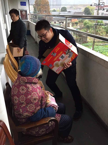 經過20多分鐘的車程,我們到達了靈山敬老院,那里很安靜祥和,大家都激動不已。因為事先聯系過,一下車,就有許多老人在門口等候我們了。看著我們帶來的一箱箱的水果和好幾袋的餅干蛋糕時,身旁的老人就一直沖著我們說:“你們太好了,還買這么多東西給我們,真是當不起的”。我們十余名團員迅速分工,有的將水果和餅干分箱裝袋,有的負責派送三樓的老人,有的負責派送二樓的老人,經過一個多小時的努力,我們終于全部派送完全部的物品。