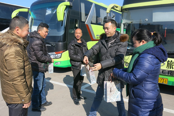 2016年1月25日上午,旅游集散中心經(jīng)理翁偉邦、副經(jīng)理薛虹及車(chē)隊(duì)隊(duì)長(zhǎng)王華南一行前往汽車(chē)東站,給在東站參加長(zhǎng)途加班運(yùn)輸工作的駕駛員送去節(jié)前問(wèn)候和慰問(wèn)品。慰問(wèn)中一再叮囑駕駛員要注意安全,在駕車(chē)時(shí)必須控制好車(chē)速,做好保暖工作,搭班駕駛員互相照應(yīng),不疲勞駕駛,注意自身健康。