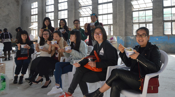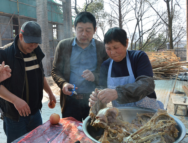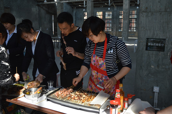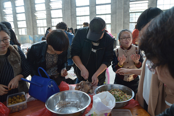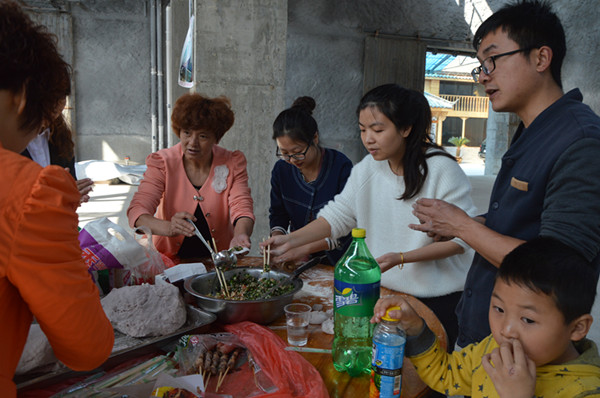 這邊包餃子的問題正討論的激烈,那邊熱氣騰騰的豬頭也出鍋了?!把剑@么大的豬頭,小時候過年的感覺”?!皩Π。瑢Π?,這種氣氛,這種味道,太有紀念意義了”?!皝韥韥?,我拍張照片,微信朋友圈曬一曬”。黃色餃子、綠色餃子、紅色餃子、紫色餃子相繼的出鍋了,燒烤的食品也相繼出爐,大家互相品評,因為都是自己動手參與,一切都變成了美食。