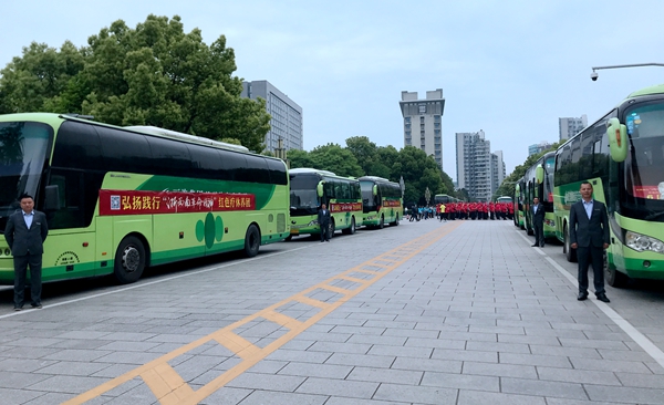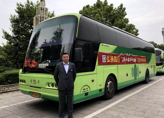 4月19日早上,在市政府南門(mén)廣場(chǎng),麗汽集團(tuán)旅游汽車(chē)分公司16輛綠色豪華大巴齊刷刷地排列著,16位駕駛員統(tǒng)一著裝,整齊劃一地站在車(chē)門(mén)迎候游客。這是2019年麗水市弘揚(yáng)踐行“浙西南革命精神”系列活動(dòng)啟動(dòng)儀式暨勞模、一線(優(yōu)秀)職工紅色療休養(yǎng)活動(dòng)發(fā)團(tuán)儀式的現(xiàn)場(chǎng)。綠色大巴與著紅色服裝的先進(jìn)相互映襯,形成了“紅+綠”融合發(fā)展的場(chǎng)景,和諧的畫(huà)面吸引了在場(chǎng)人員的關(guān)注,紛紛拿出手機(jī)拍場(chǎng)景,曬朋友圈。