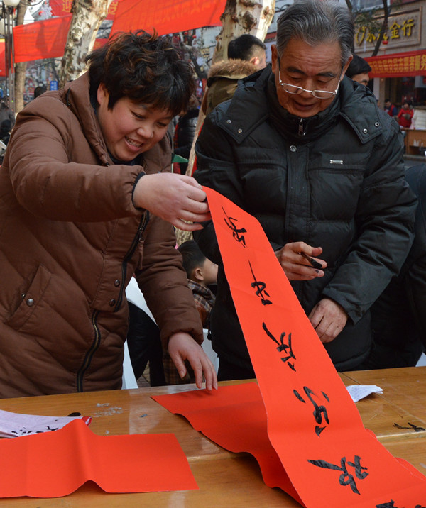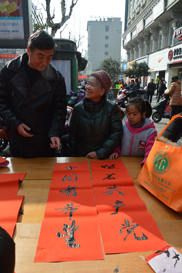 幾張小桌子拼成的簡易書案更是黨員一條街上靚麗的風(fēng)景。三位老同志一落筆,書案旁邊一下子就圍滿了人,大家一邊排隊等候著“墨寶”,一邊點贊著三位老師的書法。葉女士高興地說:“手寫的春聯(lián)不僅更有年味,而且還是在弘揚(yáng)中國的書法藝術(shù)。中國傳統(tǒng)的年俗文化,現(xiàn)在已經(jīng)越來越難得了。”一對雙胞胎寶寶的父母恰巧推著嬰兒車從服務(wù)點前經(jīng)過,趕緊請老師寫下“開心寶貝”四個字,還說是給孩子倆最珍貴的新年禮物。
