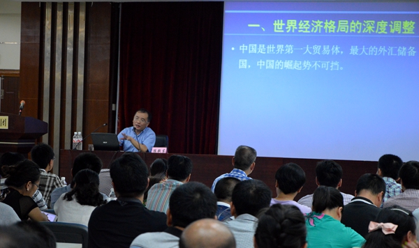 在上課過程中,陳敬東教授圍繞世界經濟格局的深度調整、中國經濟的換檔期和陣痛期、大膽創新落實改革意圖、中國經濟的發展趨勢分析及新形勢下企業如何應對挑戰等五個方面對當前宏觀經濟形勢進行了分析講解。在企業如何應挑戰中,陳教授指出:在當前形勢下,企業應從培育新的意識、找準新的定位、制定新的戰略、開發新的產品和服務、建立新的品牌等方面進行努力,迎接新一輪挑戰。