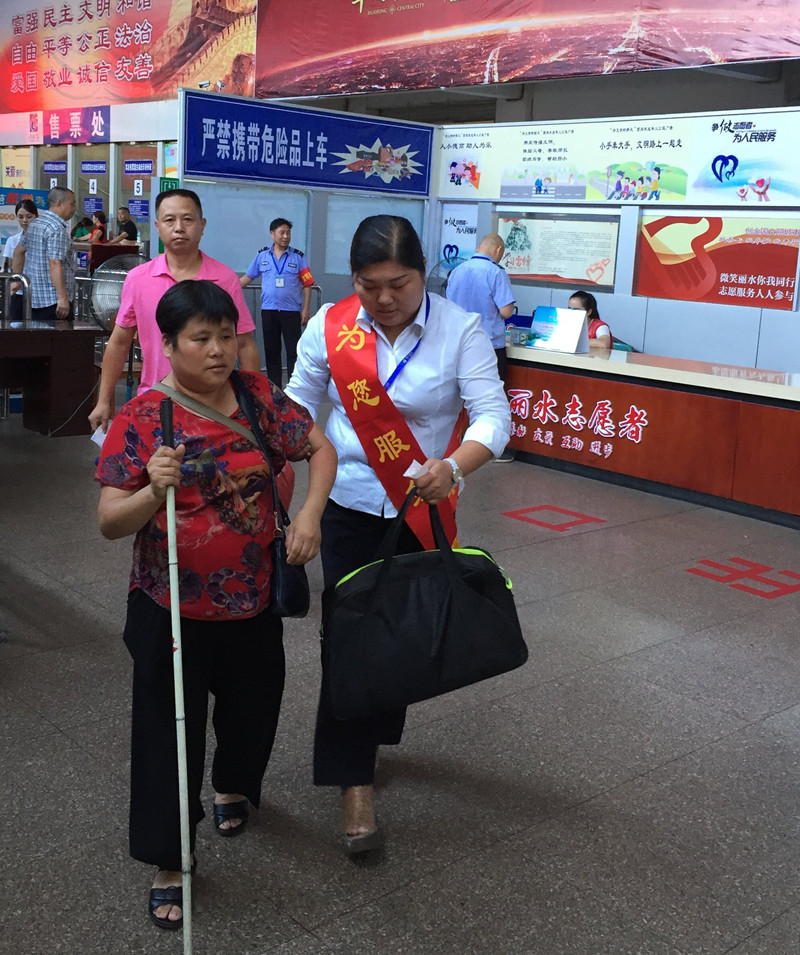 大姐的眼睛因為一年前得了疾病導(dǎo)致看不見,今天到東站準(zhǔn)備坐車去縉云。當(dāng)時正在售票廳引導(dǎo)一米線的毛麗珍看到了正慢慢摸索、一步步小心翼翼往前走的大姐。她趕緊上前扶著大姐并幫她購買了去縉云的車票,看她行走不方便,毛麗珍就一路扶著她,并一直送她到車上。別看毛麗珍人長得大個,可她的心卻細(xì)著,哪里需要轉(zhuǎn)彎,哪里有臺階,哪里需要注意的,她都一一耐心的提醒大姐小心注意。