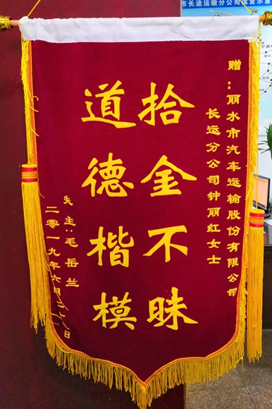 7月5日上午,一位老大爺來東站找到車隊,將一面寫著“拾金不昧,道德楷模”八個大字的大紅錦旗,送到長運(東站)車隊長鄭國勇手里,一定要好好感謝車隊駕駛員鐘麗紅。
